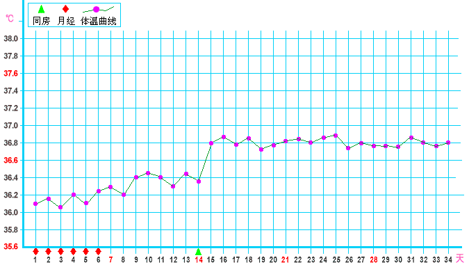 图示为没有排卵的基础体温曲线图,持续低温,没有高温期,没有形成高低温双相变化,如果是测量发现有如图示的姐妹需要到医院就诊,检查是什么原因造成没有排卵,以便对症下药,及早治愈!