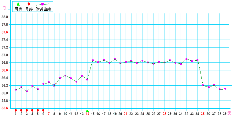 图示为已经怀孕的基础体温曲线图,高温从第 15 天持续到第 34 天,已经持续 20 天。一般来说高温持续超过 16 天就是怀孕的征兆。