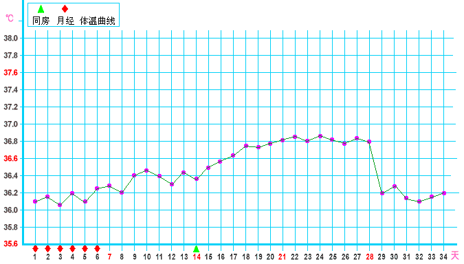 上图表示正常月经周期 28 天,基础体温曲线呈现标准的高低温两相变化。从月经开始 - 排卵日,低温期 14 天;排卵后持续高温 14 天,其中第 14 天为排卵日。